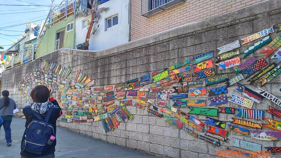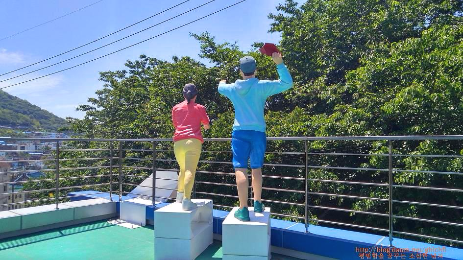 감천마을에는 우리에게 알려진 조형물들이 많죠. 물고기 조형물에도 많은 여행객들이 사진을 찍기 위해 줄을 서며 기다리고 있었습니다. 사진을 찍기 위해 기다리면서 사진을 촬영하는 젊은 사람들을 바라봤습니다. 다른 사람의 시선은 의식하지 않고 다양한 표정과 제스처로 촬영하는 모습은 멋지고 부러웠습니다. 저도 다양한 연출사진을 찍어보고 싶은데 포즈 취하는 게 너무 부끄러워 이렇게만 사진을 담아보았습니다.